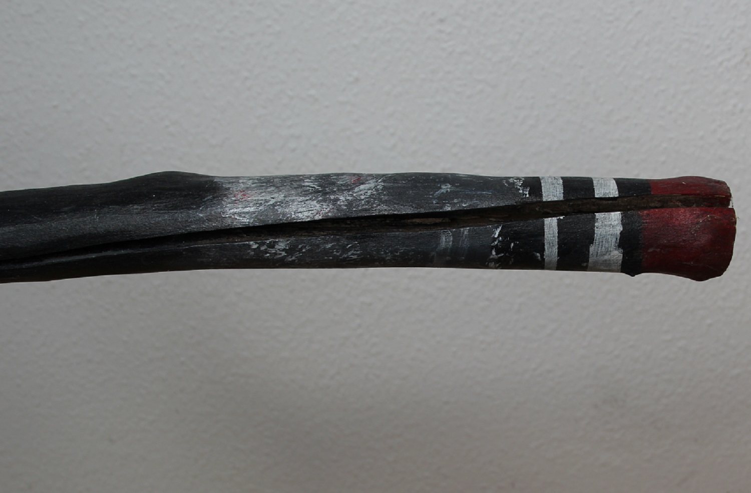 Der Zeremonienstab wurde von mir nur hervorgehoben, nicht geschaffen. Ich folgte dem, das nicht offensichtlich und dennoch da war. Der Stab wurde nur bemalt und ansonsten nicht verändert. Keine Bohrung, keine Veränderung der Form – ich hob nur das hervor, was durch Farbe besser zu erkennen ist. Einzig das Ende wurde per Säge bestimmt. Ein Fluss, der ein Auge trägt, zieht sich bis zum dreifachen Kopf. Es ist der unbekannte Fluss, der in das Reich der Toten führt und mit der Anderwelt in Verbindung steht.